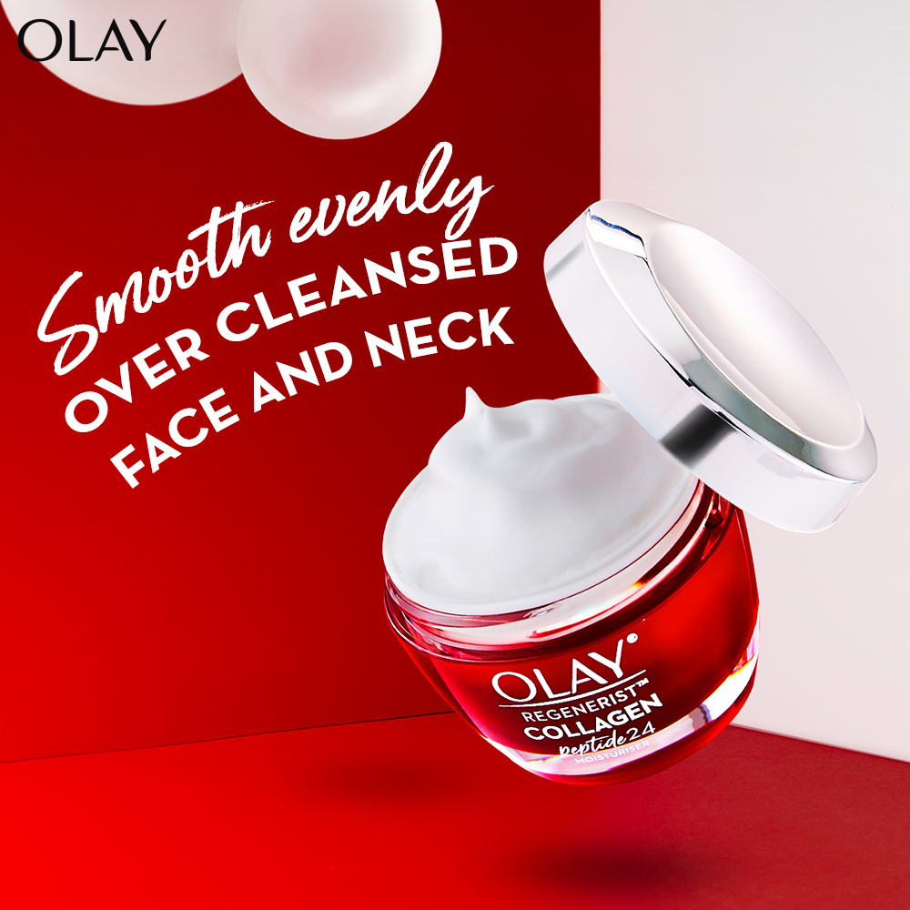 Plump & Bouncy Skin all day long. Olay’s Unique technology Collagen Peptide 24 penetrates^ better into the skin. Regular collagen have larger molecules that couldn’t penetrate into the skin. Olay’s Collagen Peptide is a smaller molecule, hence it penetrates^ better into the skin.