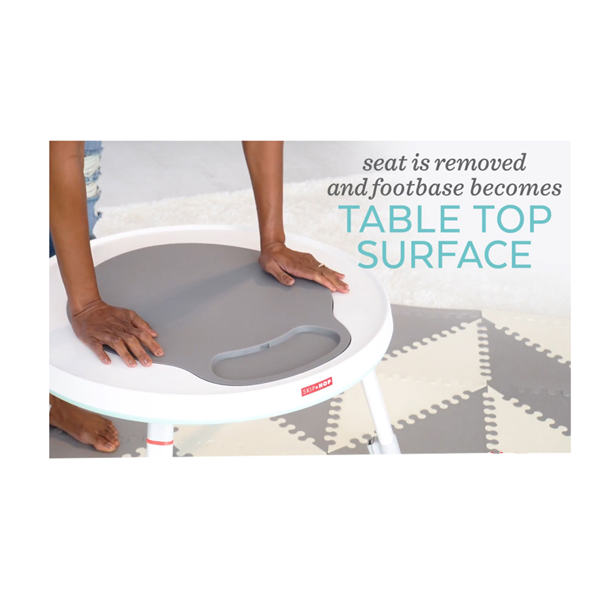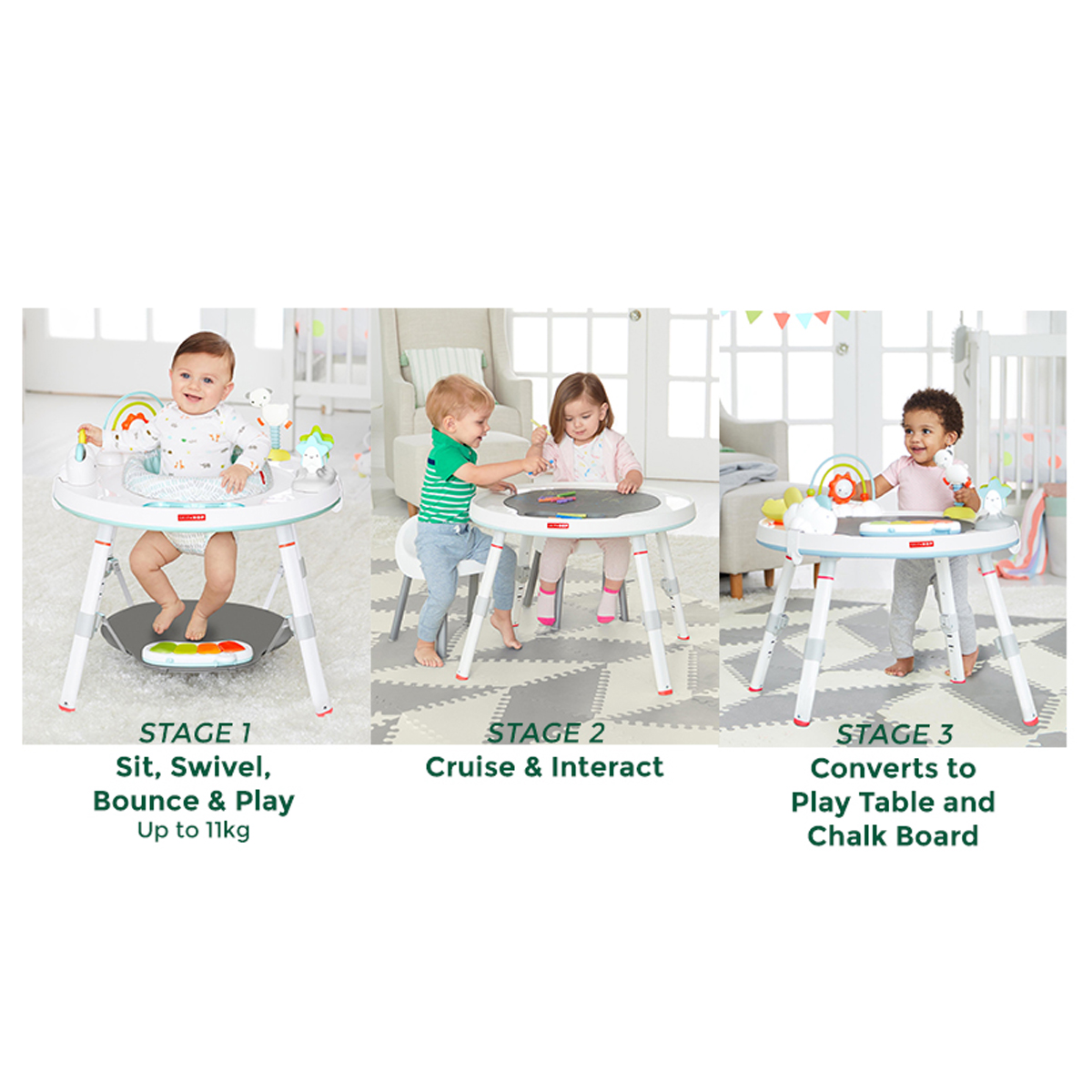 Designed to grow with baby in three stages, Skip Hop's Silver Lining Cloud Baby's View Activity Center is an action-packed take on our best-selling gym. Feauturing the same developmental approach to play and learning as our Explore & More version, the dcor-friendly design features a 360-degree rotating seat that turns and stretches for bouncing. Our unique Discovery Window gives little ones a clear view of their feet as they play the light-up piano to connect cause and effect. Four dreamy toys can be rearranged for customized play. As baby grows, the activity center converts for easy cruising. At stage three, it transforms into a sturdy toddler table with a plastic chalkboard surface for drawing, playingthe sky's the limit!